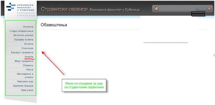 Анкете се налазе у менију са опцијама за рад са студентским сервисима, са леве стране. Слика доле: