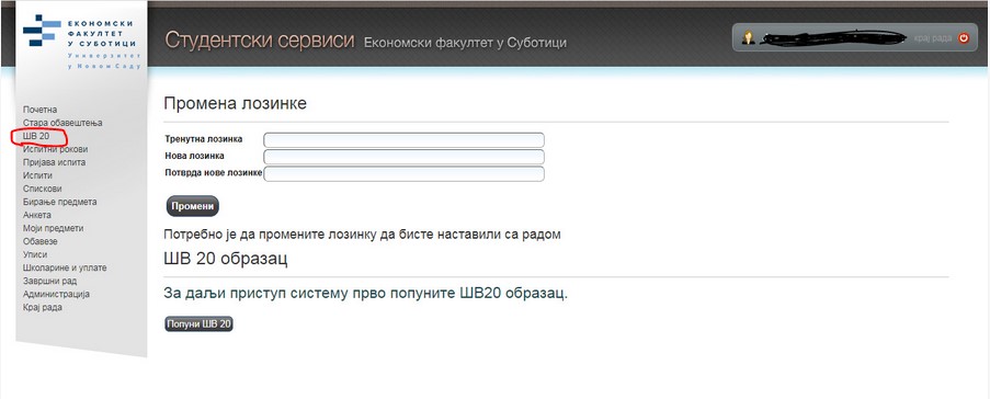 Након што се студент улогује потребно је да промени лозинку и да након тога ОБАВЕЗНО попуни податке предвиђене у обрасцу ШВ-20 (слика доле), најкасније до петка 5. децембра 2025. године.