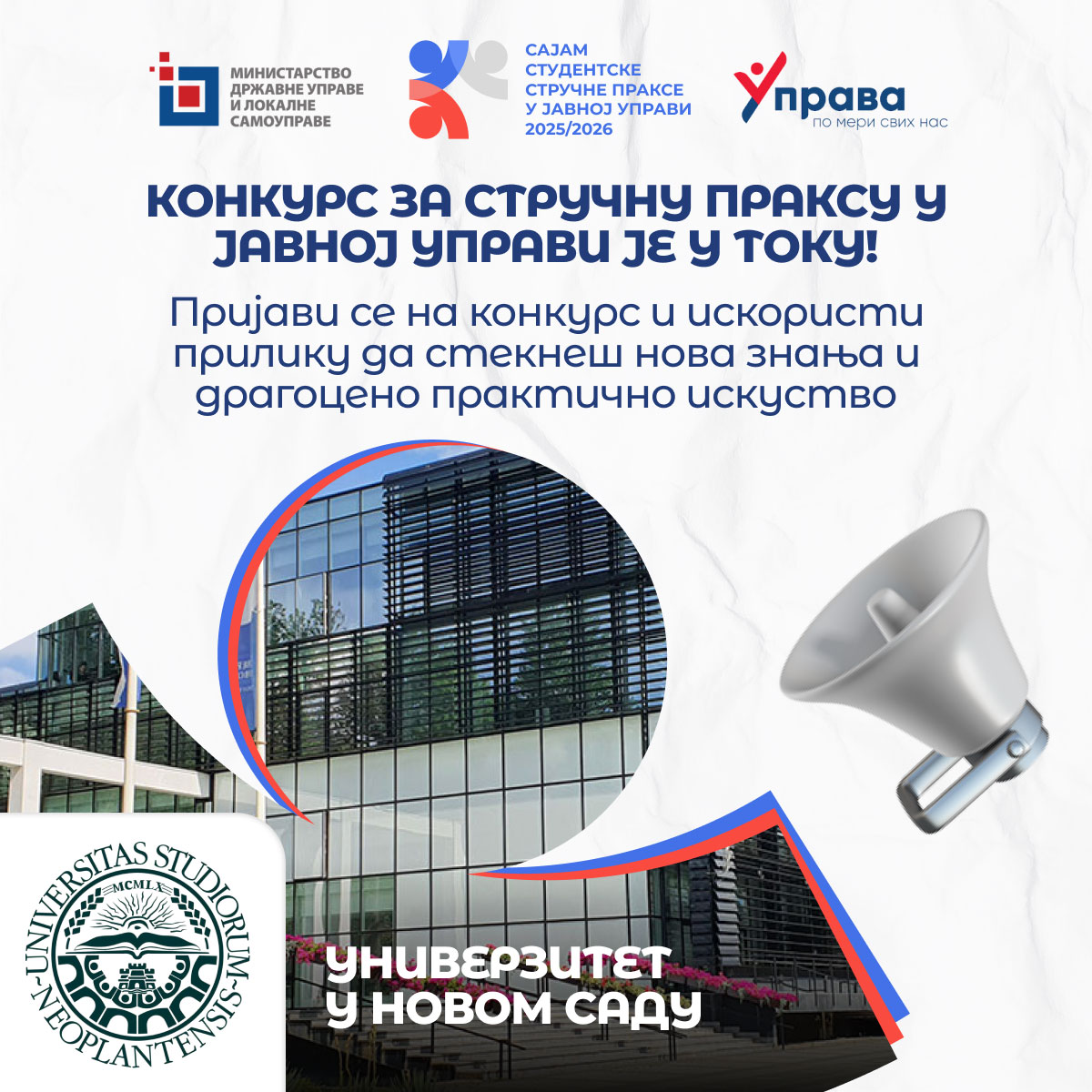 Универзитет у Новом Саду, у складу са Програмом сарадње у пружању подршке јавне управе високошколским установама за 2025/26. годину, закљученим између Министарства државне управе и локалне самоуправе и Универзитета, расписује Конкурс за избор студената за похађање Студентске стручне праксе у јавној управи 2025/26. године.