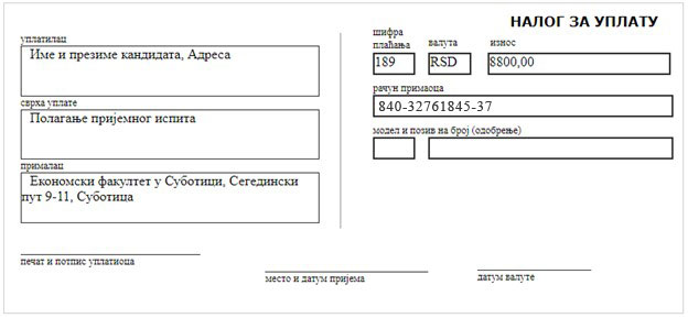 Напомена: Изглед уплатнице је исти за кандидате који конкуришу у Суботици и на Одељењима у Новом Саду и Бујановцу